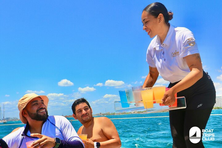 Cancun: Check-in at the marina ticket booth with your reservation details. The host will guide you to the waiting area and onto your deluxe shared catamaran. Receive safety instructions and enjoy complimentary drinks from the open bar throughout the trip.